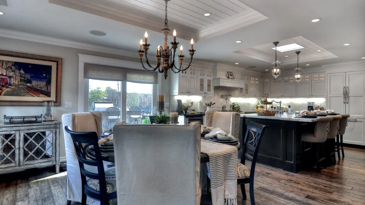 Calcutta marble-topped kitchen island Tongue and groove paneling with recessed soffits throughout